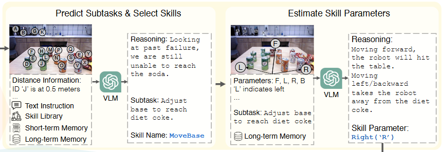 - library of parameterized skills 및 VLM의 reasoning capabilites를 활용하여, subtask 및 skill을 예측하고 skill parameters를 추정하여 로봇의 motion을 결정